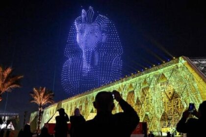 A drone light show depicts ancient Pharaoh King Tutankhamen’s sarcophagus during the opening ceremony of the Grand Egyptian Museum (GEM), near the Giza pyramid complex, in Giza, Egypt, November ...