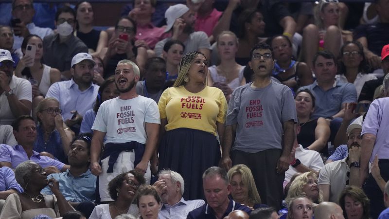 Climate protestors also disrupted last year’s French Open and matches earlier this year at Wimbledon, where they sprinkled orange confetti and jigsaw puzzle pieces on the grass playing surface.