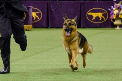 A German Shepard runs with its owner at a dog show in this undated image. — Reuters Some super-smart dogs may be able to pick up new words simply by listening to people talk, much like young children ...